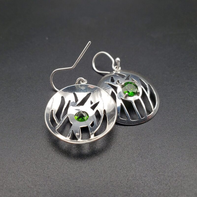 Boucles d’oreilles en argent ornées d’un beau diopside vert profond.