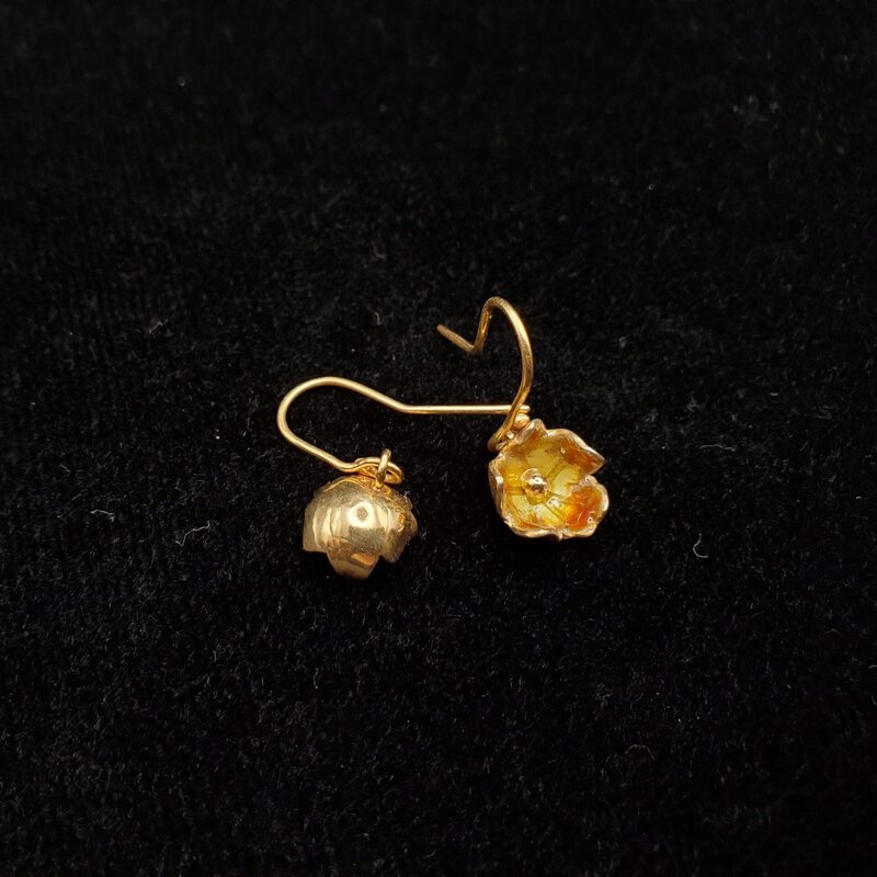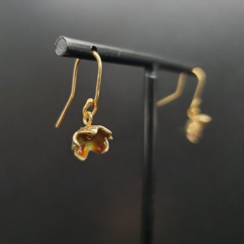 Ces boucles d’oreilles toutes petites et légères se démarquent par les teintes chaudes de leur émail grand feu et leur généreuse dorure à l’or, que je réalise moi-même.