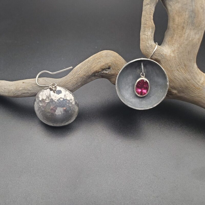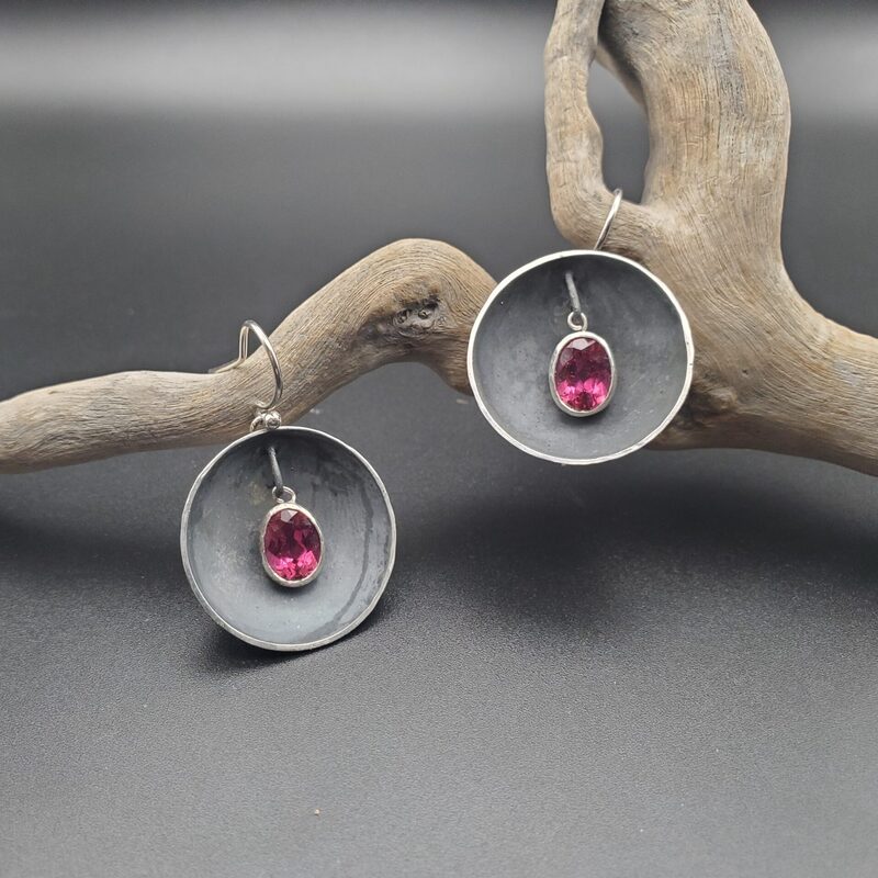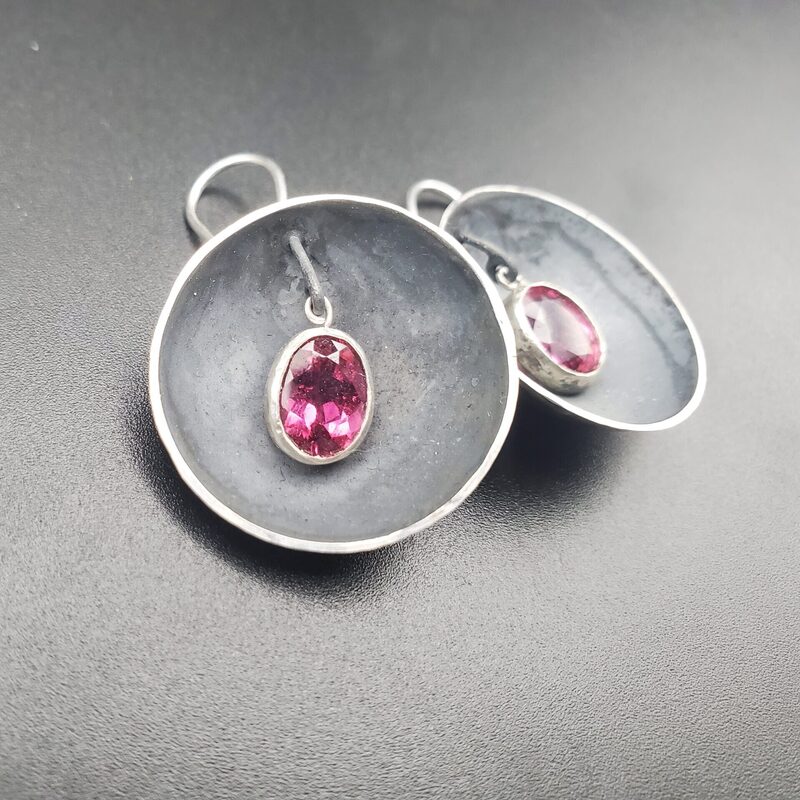 Boucles d’oreilles hémisphériques faites main en argent martelé, noirci, et rubellites d’une couleur idéale.