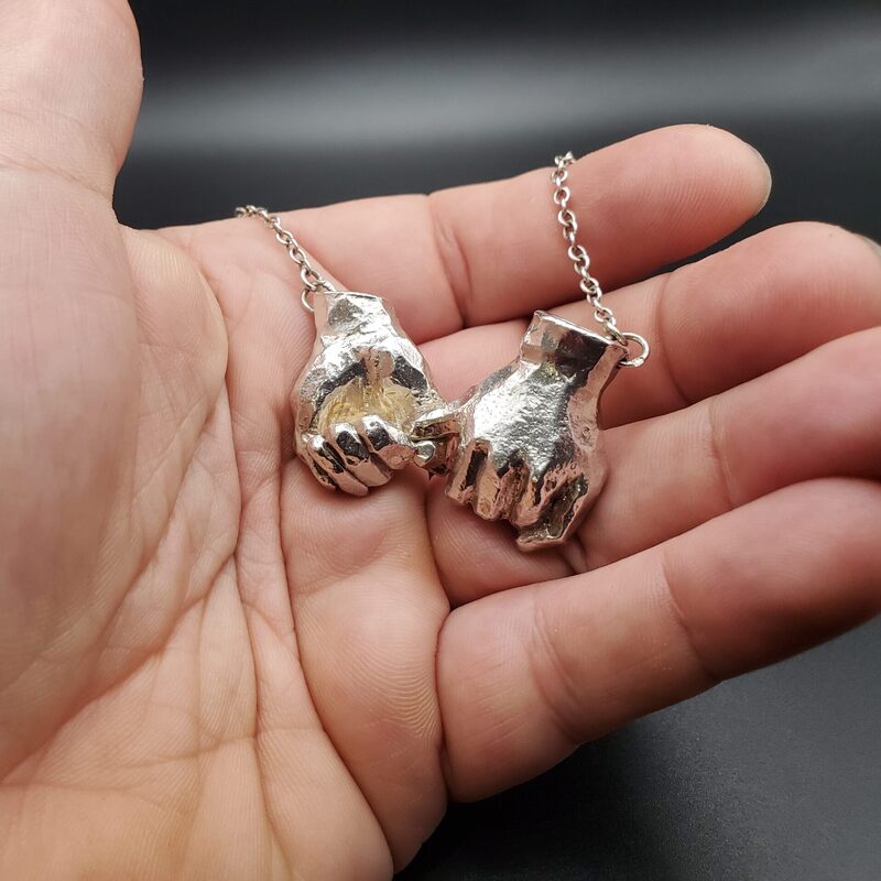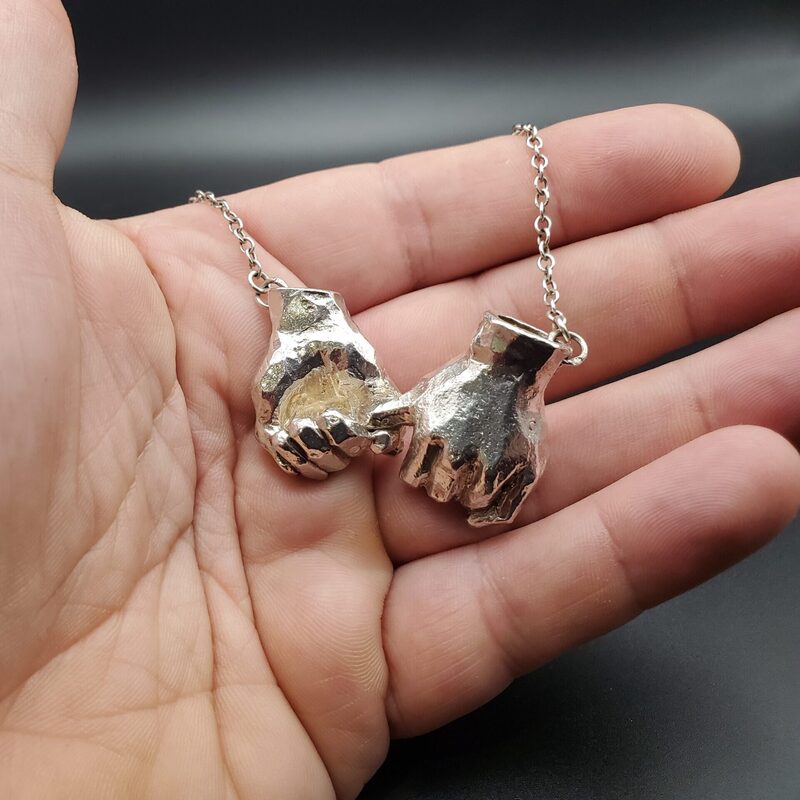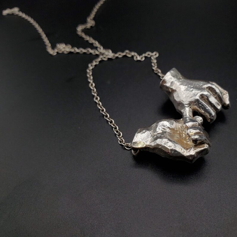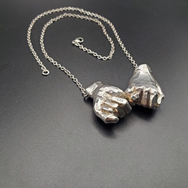 45g d’argent pour ce collier sculpture de deux mains se faisant une promesse solennelle.